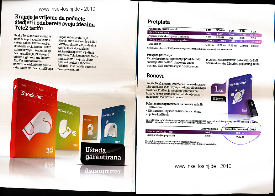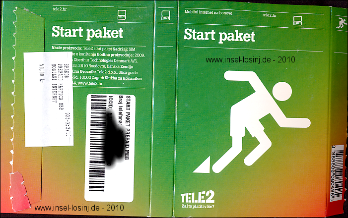 | 05.04.2010, 17:20 Uhr stefan Posts: 283 [Administrator] Extra: webmaster | Hallo Wolfgang, bin gerade von Losinj zurück. Mobiles Internet klappt prima. Ich habe mir in Rijeka eine Tele2 Sim geholt, die ausschließlich für Mobiles Internet gilt. Kaufpreis : 50 Kuna. Dann noch 100 Kuna aufgeladen (geht am einfachste wenn mann die Karte kurz in Handy tut und dort mittels SMS Code dann auflädt) und dann hatte ich 0,39 Kuna pro 1 MB. Das wären dann für 100 MB ca 40 Kuna, also ca. 6 EUR. Find ich für Prepaid internet ganz ok, also Mails checken und ab und zu heise.de und insel-losinj.de lesen .Als Hardware hab ich eine OPTION GT MAX GE0301 Express HSUPA/HSDPA Modem verwendet, gab`s bei ebay für ca. 35 EUR. Zum Thema Empfang: in Rijeka 7,2 MBit, super schnell . In Mali und Veli Losinj mindestens EDGE, an manchen Ecken auch UMTS bzw. HSDPA (wenn ich mich recht entsinne...)Gruß, Stefan Scan der Verpackung und Tarifinfo siehe unten: [ Zitatantwort - edit ] |