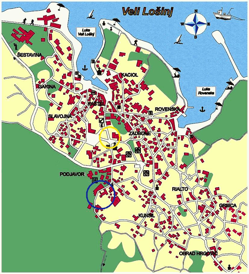 | 01.08.2001, 19:06 Uhr stefan Posts: 283 [Administrator] Extra: webmaster | Hallo nochmal, ich habe noch ein paar alte Dias gefunden. Sie zeigen einen Teil der Gebäude im oberen Teil. Außerdem gibt es einen Stadtplan (180 kByte) unter http://www.insel-losinj.de/forum/plan.jpg . Der gelbe Kreis kennzeichnet die Gebäude im "Zentrum", der blaue den Komplex im oberen Teil. MfG Stefan [ Dieser Beitrag wurde von stefan am 13.03.2007 editiert. ] [ Zitatantwort - edit ] |