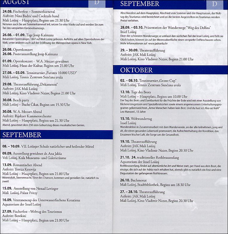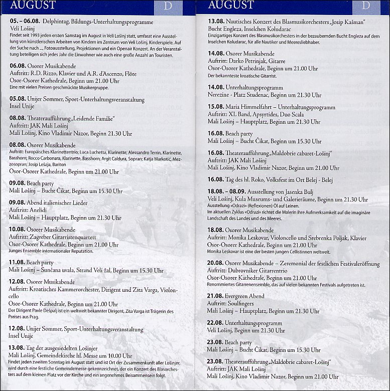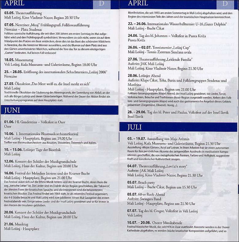 | 11.05.2006, 15:16 Uhr stefan Posts: 283 [Administrator] Extra: webmaster | Hallo drepam, ich habe Anfang April extra den aktuellen gedruckten Veranstaltungskalender des Tourismusverbandes Mali Losinj persönlich auf der Insel angeholt , gescannt und nun hier zu Info.Gruß, Stefan [ Zitatantwort - edit ] |